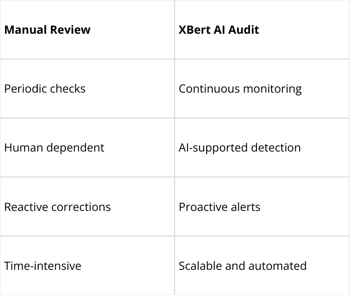 Rather than replacing accountants, XBert functions as a real-time AI audit assistant, strengthening quality control across your client portfolio.