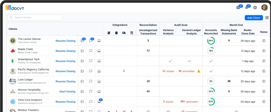Get a complete overview of client accounts, reconciliation status, and anomalies in one unified dashboard.